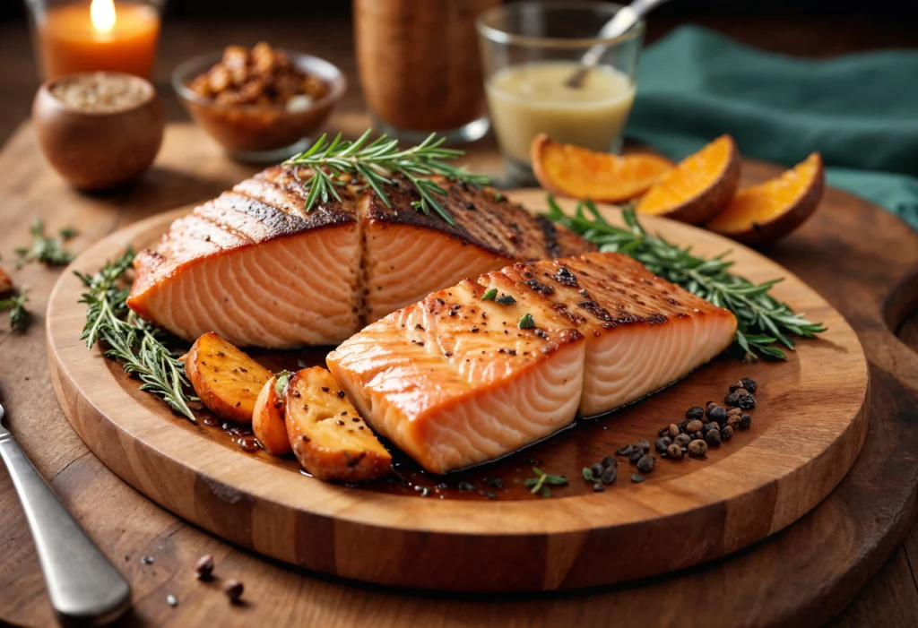 Distribuye un filete de salmón en cada plato, acompañado de una generosa porción de vegetales asados. Decora con perejil fresco picado y unas rodajas de limón para realzar la frescura del plato.