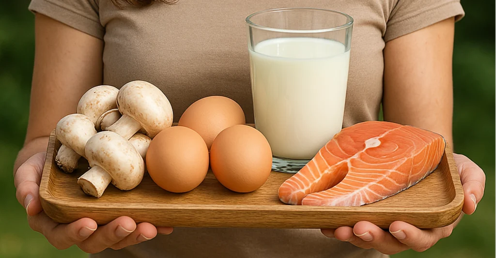 Alimentación. Pescados grasos, yemas de huevo y hongos expuestos al sol.